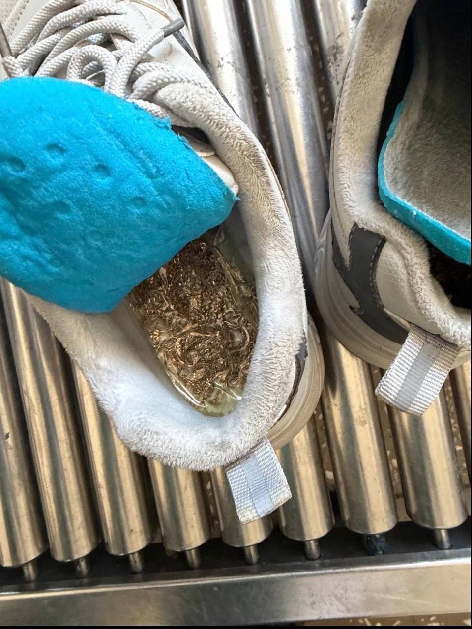 Экспертиза показала, что это сплав из золота 585-й пробы и серебра общей массой 215,7 и 17,60 граммов соответственно. Мужчина пояснил, что драгметаллы его попросил перевезти незнакомый человек за денежное вознаграждение. Он знал, что перемещаемые предметы надо декларировать, но намеренно решил спрятать их в обувь – сообщили в ФТС России.