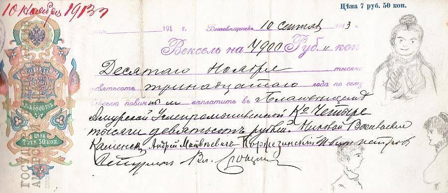 Один из найденных рисунков изображал три женских портрета: один анфас и два профиля. Эти изящные фигуры с прическами-шиньонами и стильными воротниками характерных форм эпохи представляют собой типичные женские образы начала XX века.Особенно интересен рисунок на обратной стороне одного из векселей. Здесь художник изобразил грустное свидание мужчины и женщины. По очертаниям мужчина напоминает военного, с аккуратной стрижкой.