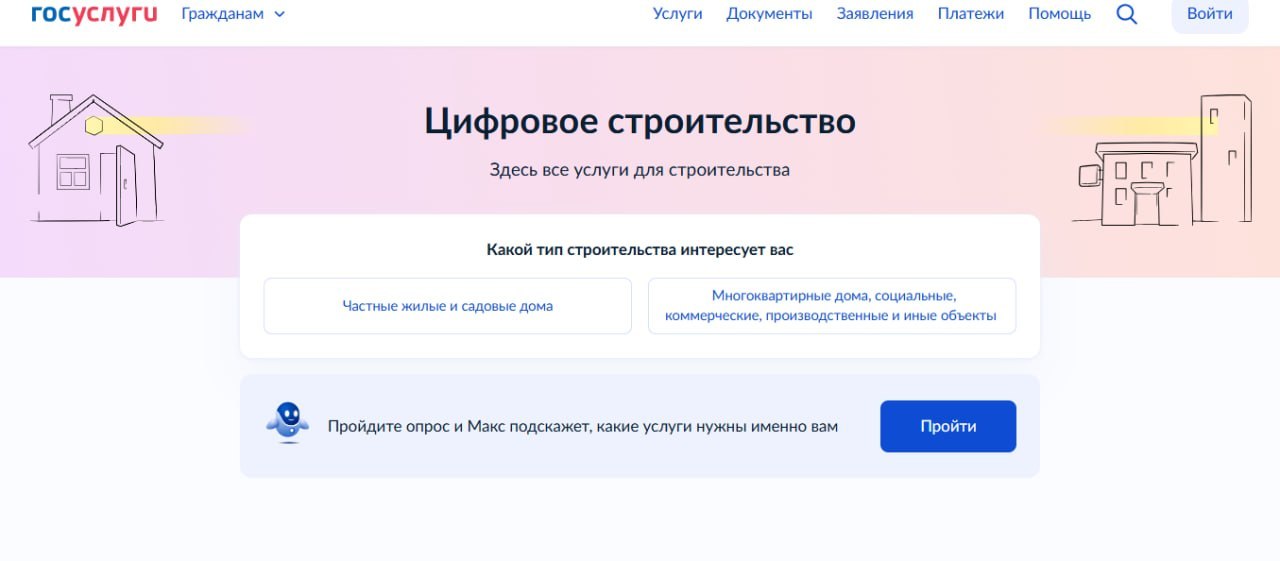 Способ 2. Через Робота Макса: просто напишите в поиске на Госуслугах «Цифровое строительство» — и робот направит вас в нужный раздел.