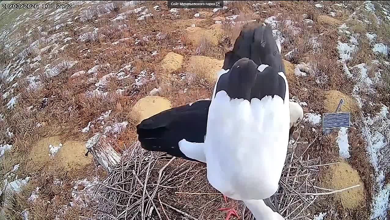 Как писала АСН24, самец прилетел в гнездо еще 14 марта и сразу же начал наводить там порядок. Но после того, как он щелканьем клюва обозначил всем принадлежность этого гнезда, он на две недели пропал из виду. Очевидно, что занимался поиском съестного на проталинах и ждал прилет самки, сделал вывод ученый.