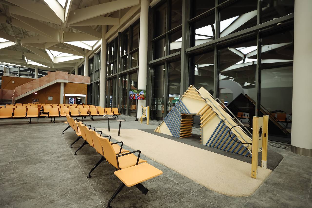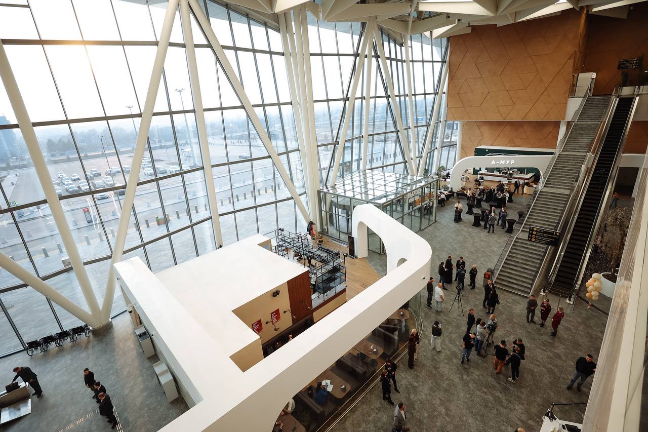 Особое внимание уделено доступной среде: в аэровокзале работают 14 лифтов, 6 эскалаторов.