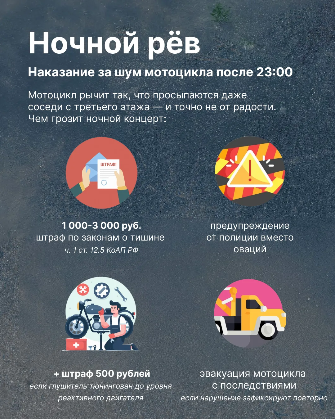 Сохраняйте и отправляйте владельцам мотоциклов. Давайте вместе предотвращать аварии и бороться с ночным рычанием!