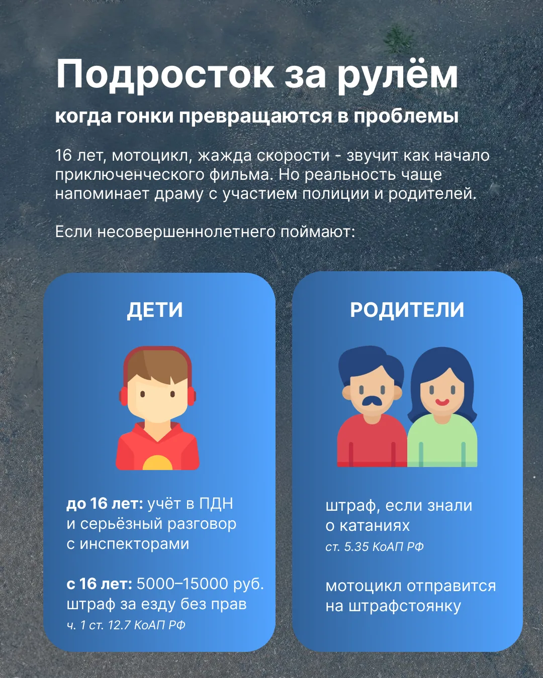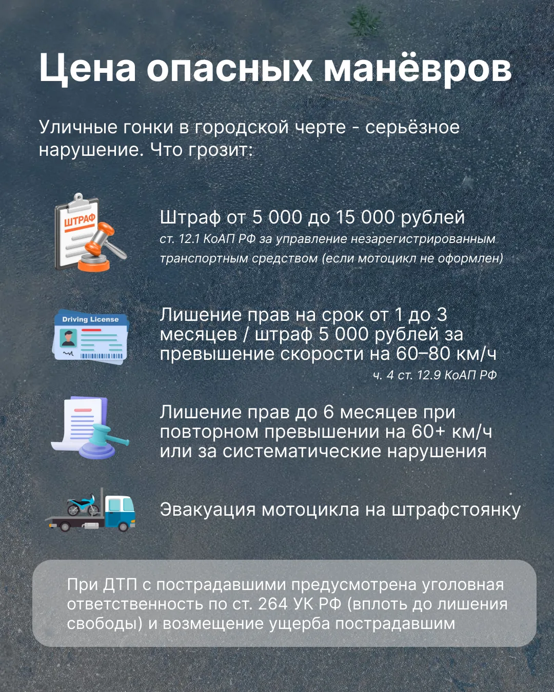 Превышение скорости, повышенный уровень шума от ТС, управление незарегистрированным мотоциклом, езда без прав, подросток у руля – всё это серьёзные нарушения.