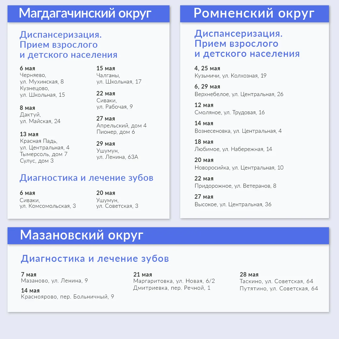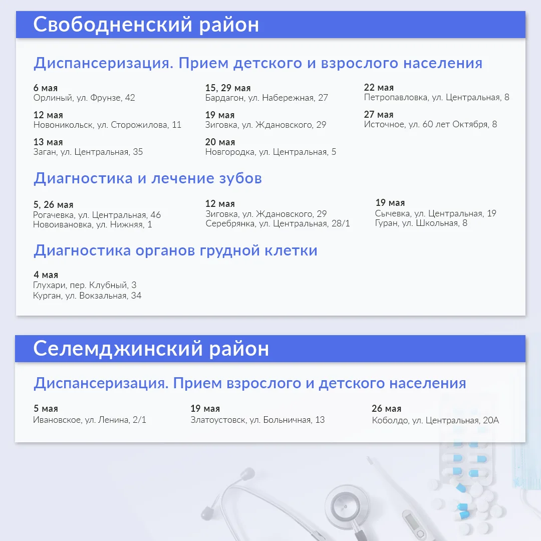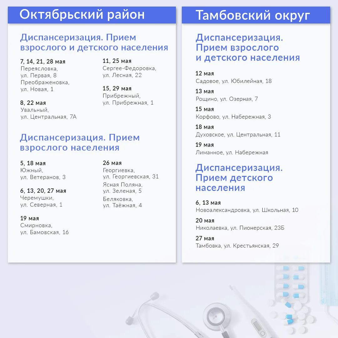 В мае медиками запланировано 288 выездов в 19 муниципалитетах. Ознакомиться с графиком можно в карточках