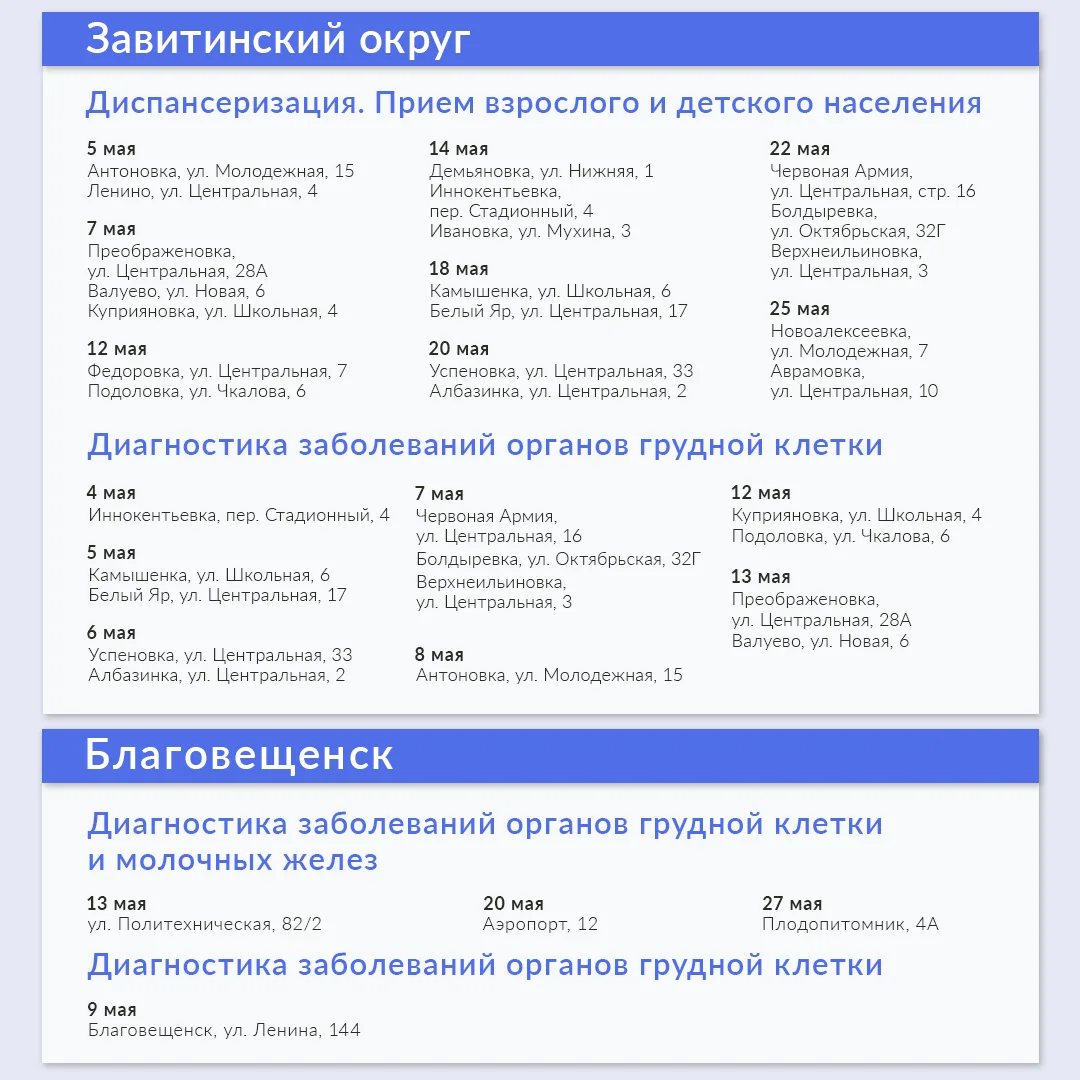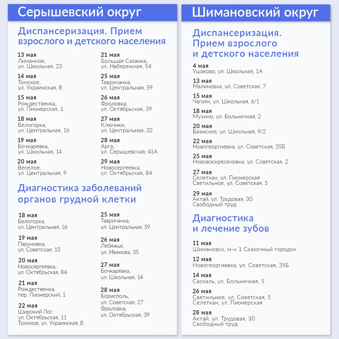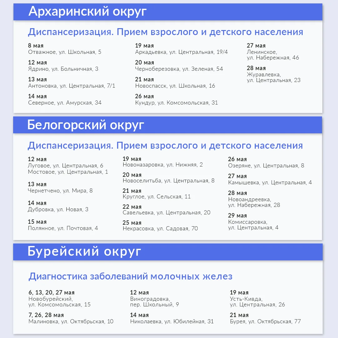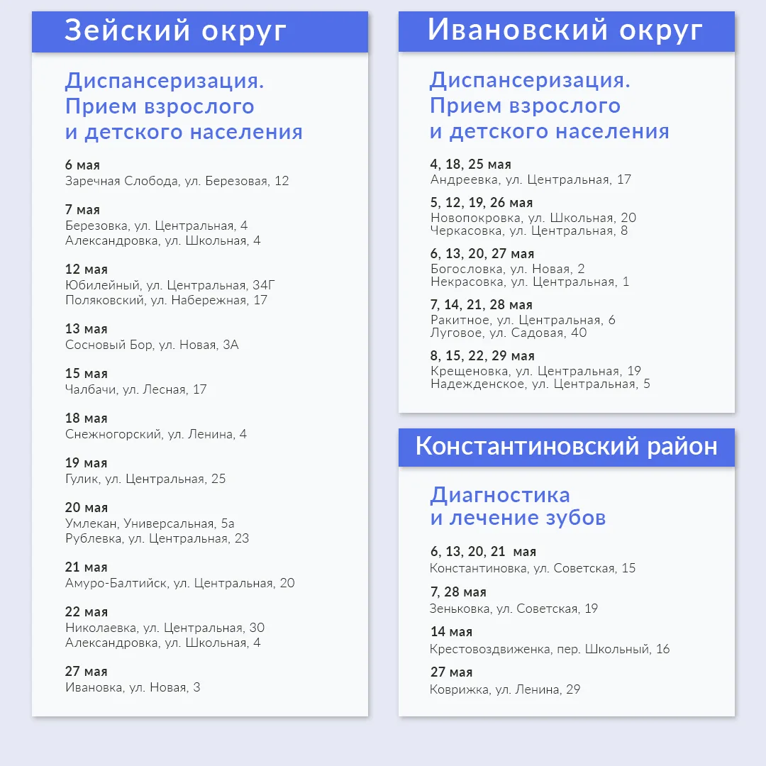 В мае медиками запланировано 288 выездов в 19 муниципалитетах. Ознакомиться с графиком можно в карточках