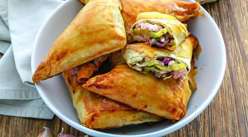 Такие пирожки, благодаря тесту фило, приобретают легкую и хрустящую текстуру, а начинка из нежных листьев ботвы дарит свежесть и легкую сладость.