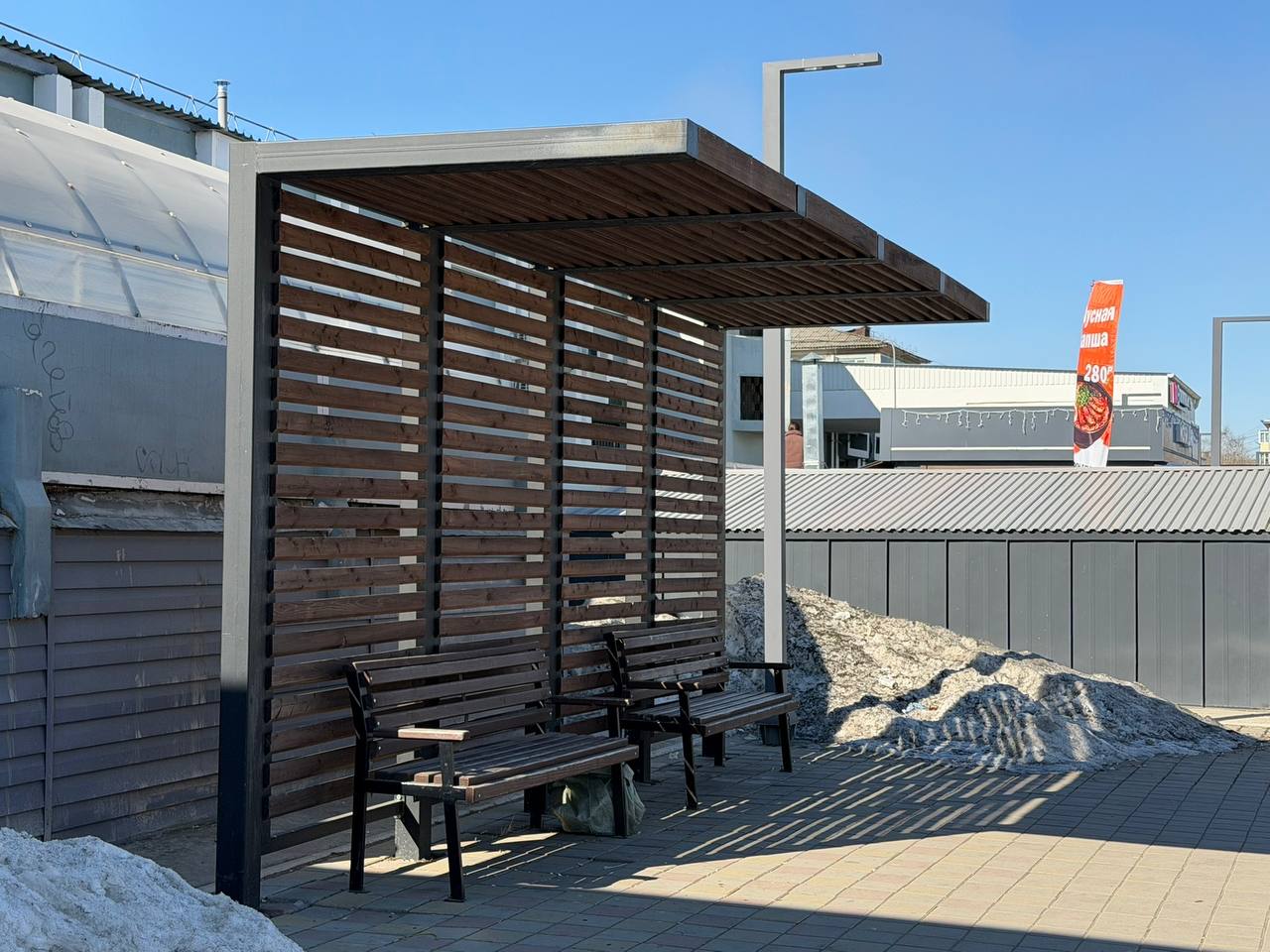Поставил задачу ЖКХ и ГСТК демонтировать одну из лавочек с навесом. Её здесь, к сожалению, используют как место для складирования мусора или ночных посиделок. Поэтому заменим конструкцию на декоративное кашпо или вазон. Много вопросов к содержанию общественной территории возле «От и До». Участок, который принадлежит владельцу здания, часто не убран — этот вопрос проработаем с предпринимателями. Также сейчас приводят в порядок внешний вид торгового центра: меняют вывески в соответствии с дизайн-кодом, ремонтируют фасад.