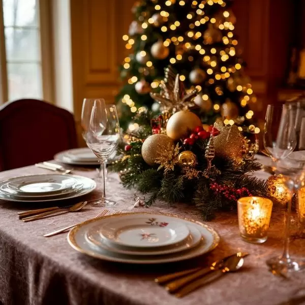 Декор стола держится в рамках простых деталей: еловые ветви, золотые акценты и свечи — чтобы вечер оставался уютным и не перегруженным.