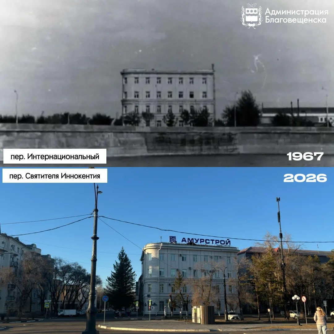 На нашем фото — вид на переулок Святителя Иннокентия со стороны Амура. Снимок сделан в 1967 году, тогда переулок назывался Интернациональным. В честь одного из основателей нашего города его назвали только в 1997 году. Любопытно, что изначально он был «американским», так как здесь находилась первая в Амурской области американская торговая фирма.