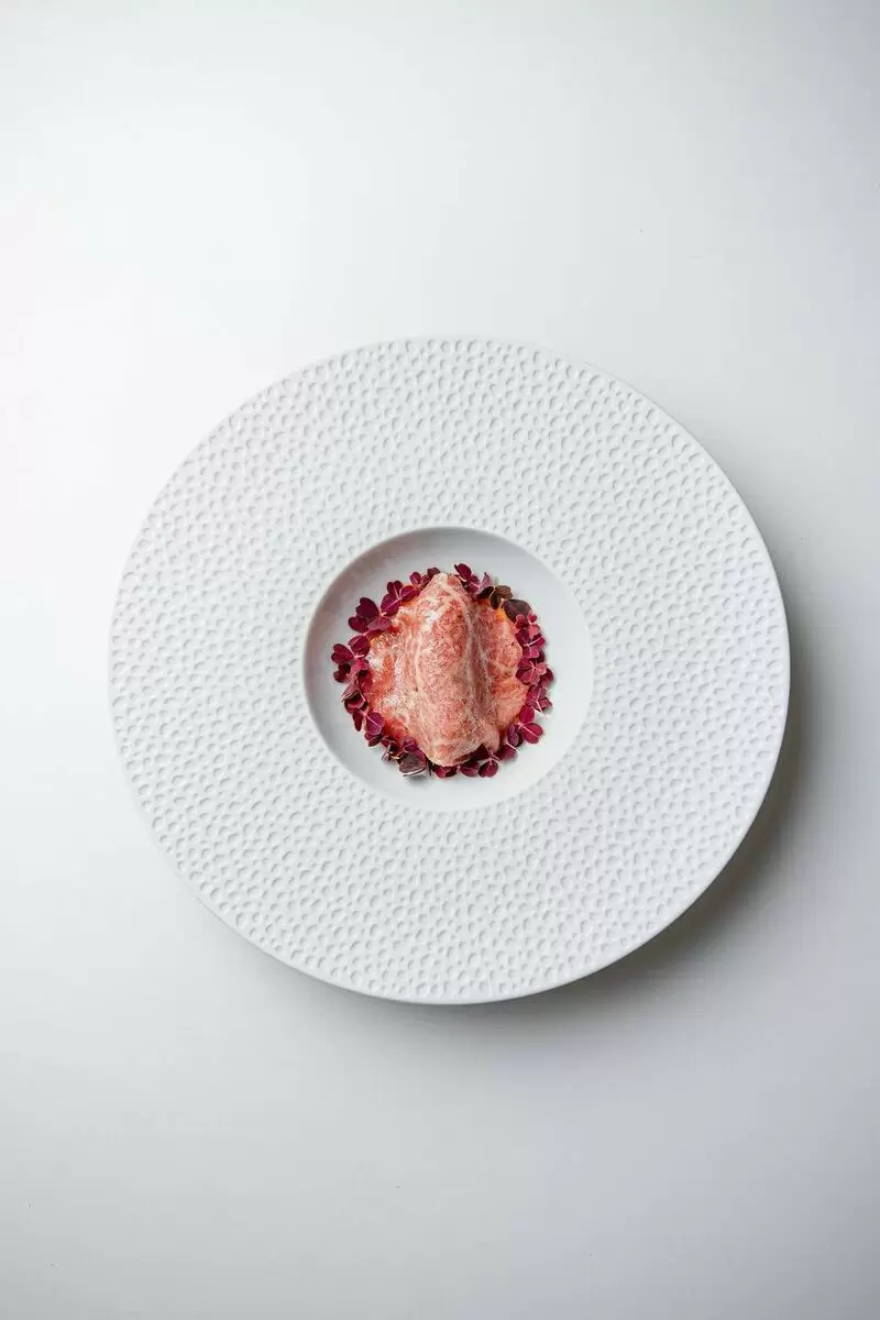 Кулебяка подаётся с бархатным сливочно-клюквенным соусом, придающим блюду невероятную кремовую текстуру. Хрустящий маринованный лук привносит нотку остроты, а свежие лепестки кислицы добавляют яркость и свежесть, что делает каждую порцию настоящим произведением искусства.