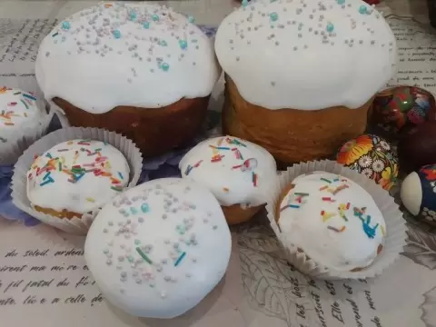 Тесто раскладывают по формам, оставляя место для роста, и отправляют в разогретую до 180 градусов духовку. Время выпекания зависит от размера куличей. После приготовления куличи остужают, а затем покрывают глазурью, приготовленной из кипящего сахара и желатина.