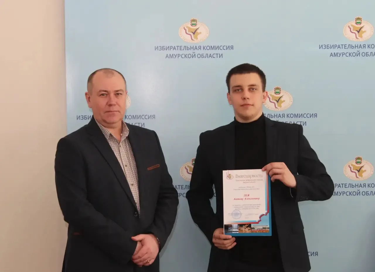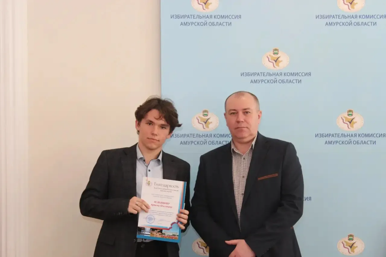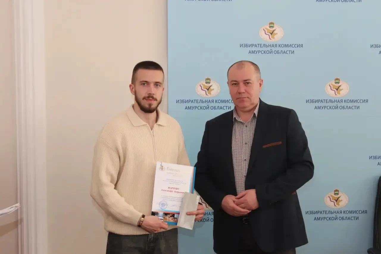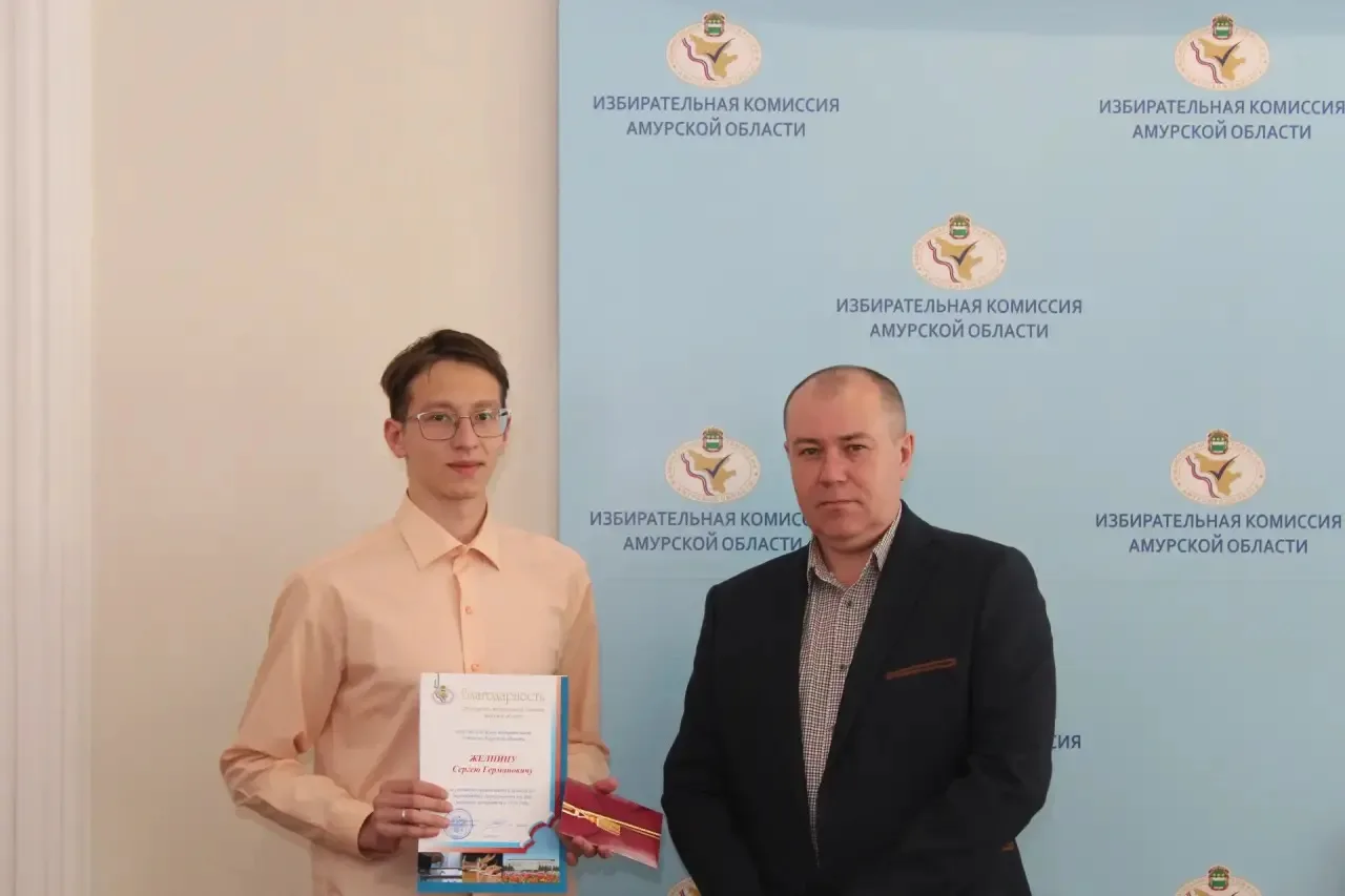 Заслуженные награды получили энтузиасты молодежной избирательной комиссии Амурской области Александр Нартов, Алина Кочан, Сергей Желнин, Денис Лебедев и Артем Зеленцов.