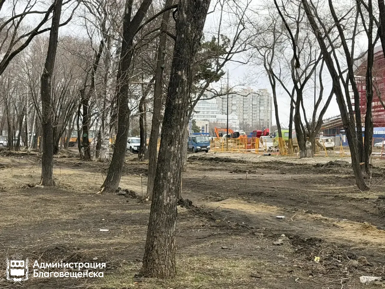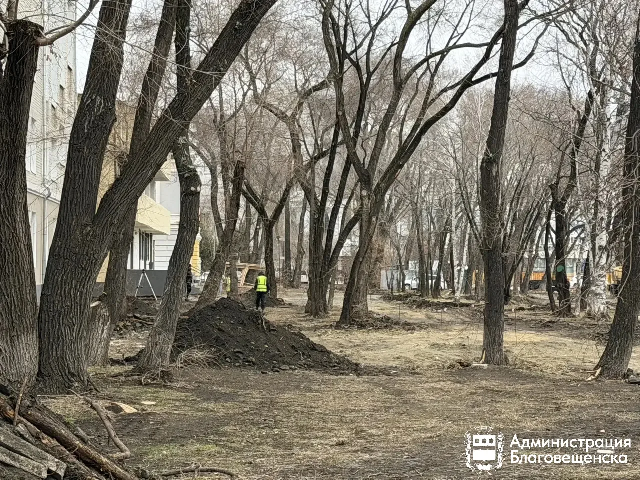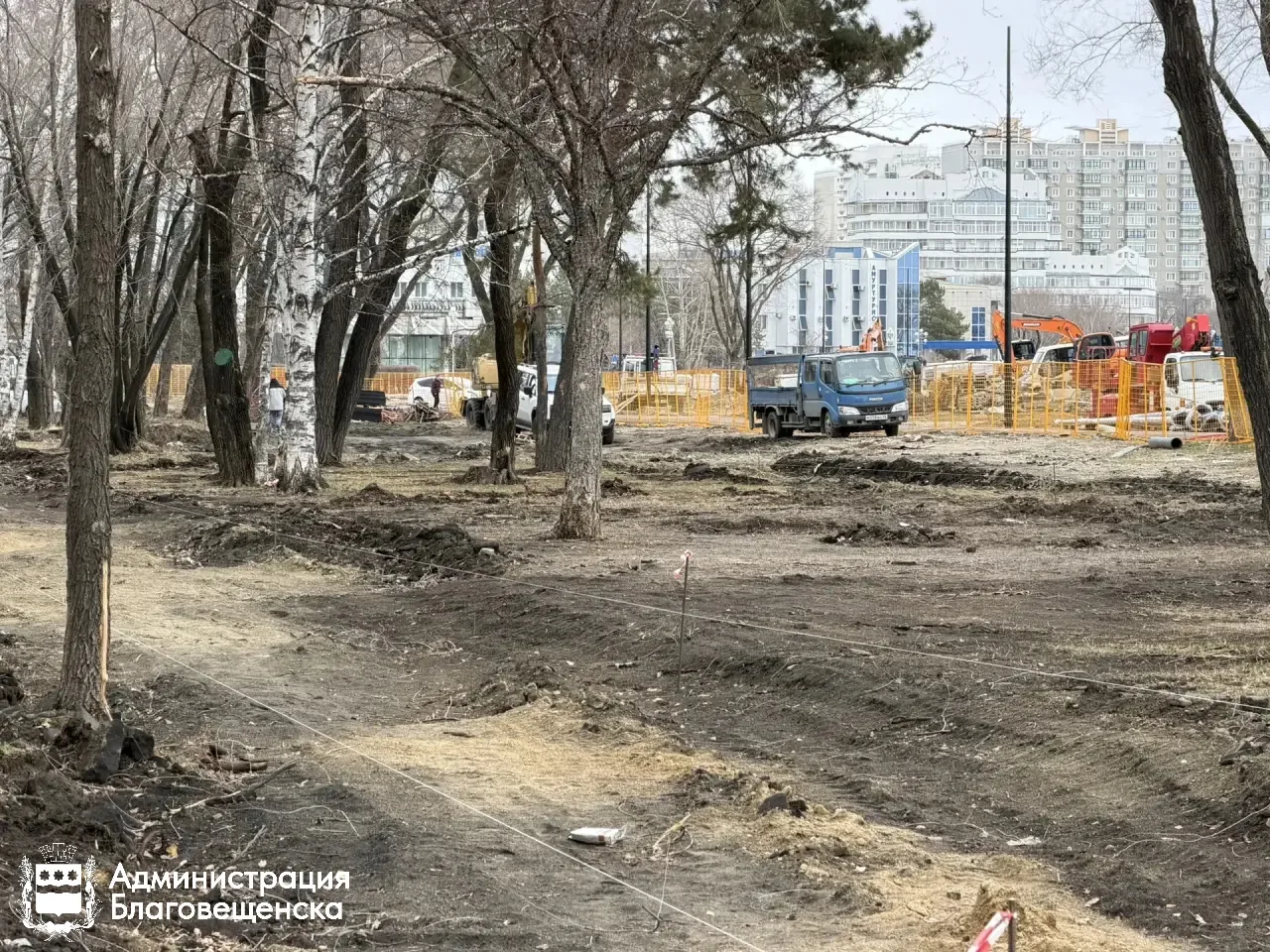 В Благовещенске приступили к благоустройству сквера за БГПУ. Подрядчик завершил демонтаж и перешёл к земляным работам: выполняет разбивку территории. После этого начнёт монтаж бортовых камней.