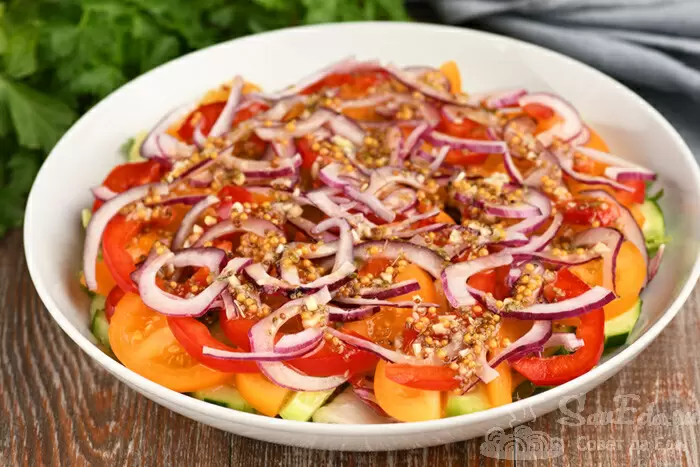 2. Салат из капусты. Нарезать белокочанную капусту, натереть морковь и порезать репчатый лук. Добавить заправку с мёдом и острым горчицей, перемешать и наслаждаться хрустящей свежестью.