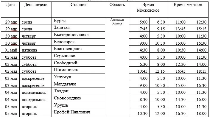 Первая остановка будет на станции Бурея, последняя — на станции Ерофей Павлович. Всего уникальный передвижной музей о Великой Отечественной войне увидят на 14 станциях. В Белогорске поезд ждут 30 апреля с 15:00, в Благовещенск он прибудет 1 мая.