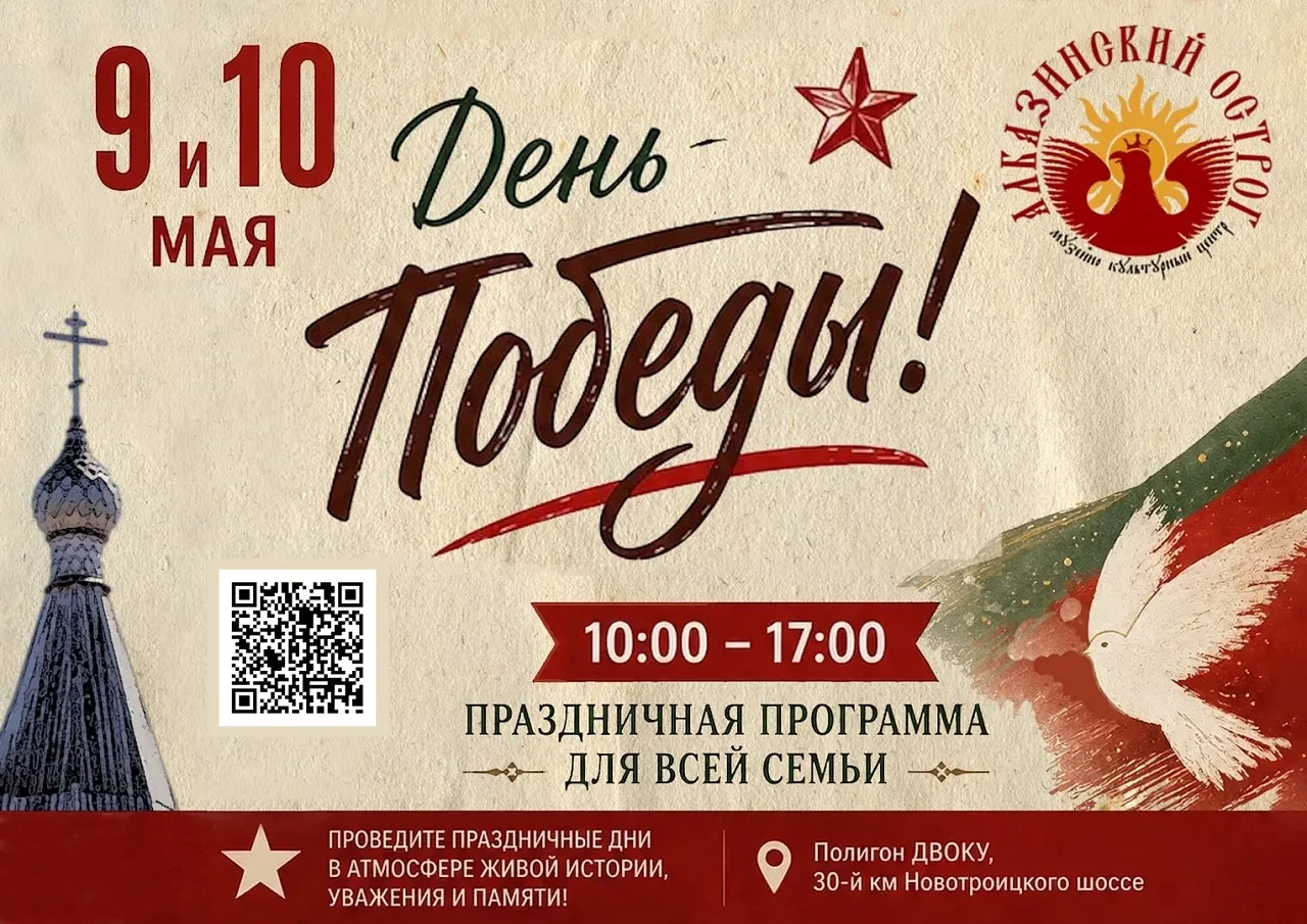 Музейно-культурный центр «Албазинский острог» приглашает посетить праздничную программу в честь Дня Победы. Мероприятия пройдут 9 и 10 мая с 10:00 до 17:00.